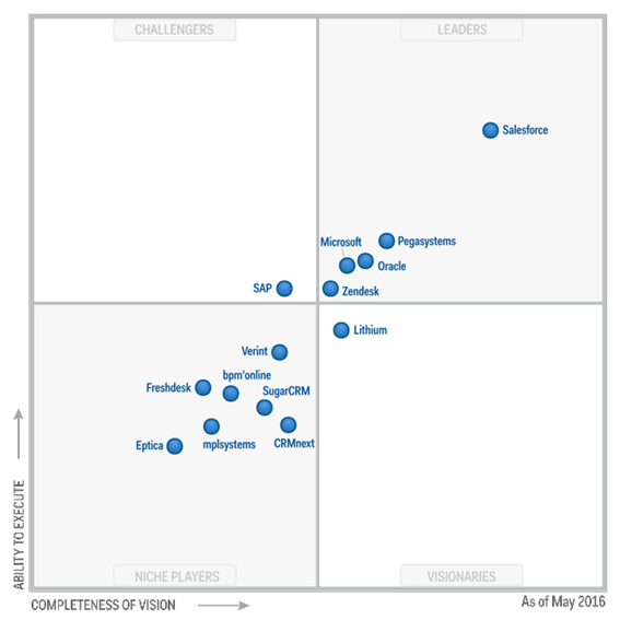 No existen muchos cambios con respecto al año pasado. Salesforce sigue liderando el mercado ya que son los primeros en cuanto a su habilidad para ejecutar y en cuanto a su visión del producto. En el cuadrante de líderes, además de los cuatro que aparecían en 2015 (Salesforce, Pegasystems, Oracle y Microsoft) en esta ocasión se incorpora Zendesk que antes se encontraba en el cuadrante de visionarios, junto a Lithium. En el cuadrante de aspirante solo nos encontramos a SAP, al igual que el año pasado.