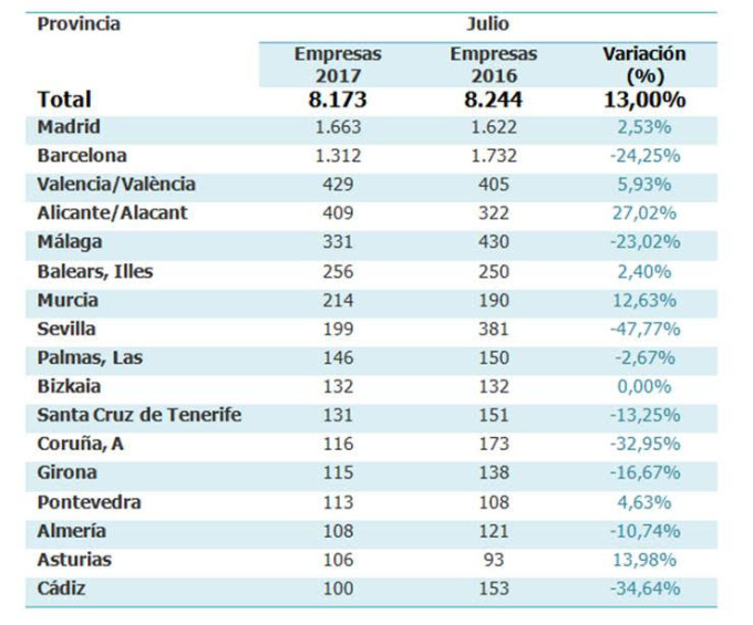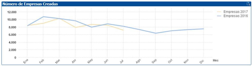 En tasa interanual también hay un descenso de un 13%, en julio del año pasado se contabilizaron 8.244 nuevas sociedades. Además, en los siete primeros meses de 2017 nuestro país ha generado un total de 60.133 nuevas compañías.