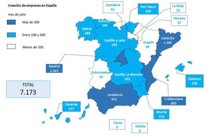 Por provincias, de la totalidad de empresas creadas en el mes de julio Madrid continúa siendo la provincia donde más empresas se crean. Así, representa el 23,18% del total de las sociedades creadas, con 1.663 nuevas constituciones. A Madrid le sigue de cerca Barcelona, que ha contabilizado 1.312 empresas, el 18,29% del total de los nuevos negocios que se han creado a nivel nacional. A bastante distancia, completan elranking de las provincias que más empresas han generado durante el mes de julio Valencia con 429 sociedades y Alicante con 409 nuevas sociedades.