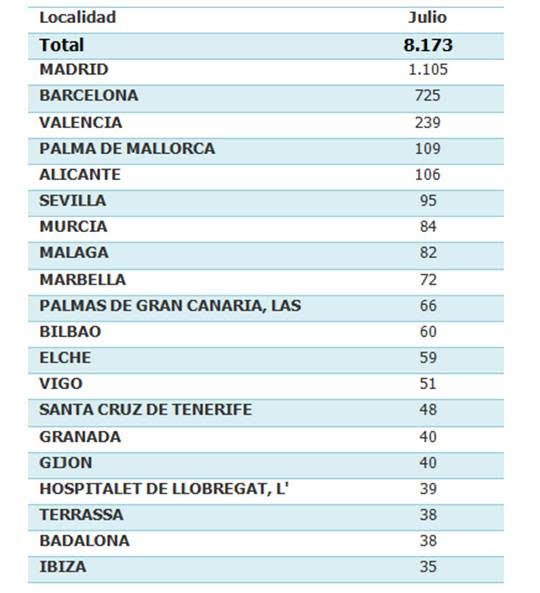 En cuanto a los municipios, las cuatro localidades en las que se han creado un mayor número de nuevas empresas han sido Madrid, Barcelona, Valencia y Palma de Mallorca. La localización de constitución de nuevas empresas sigue coincidiendo, prácticamente en su totalidad, con las capitales de provincia. Sin embargo, localidades con fuerte presencia industrial o que cuentan con un sector turístico potente se siguen afianzando en las primeras posiciones del ranking nacional. Localidades como Gijón, Hospitalet de Llobregat, Terrassa, Badalona e Ibiza se sitúan este mes de julio en el top 20.