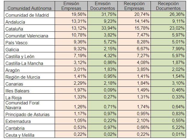 Un año más las empresas de Madrid, Cataluña y Andalucía encabezan el ranking por volumen de documentos emitidos. Las empresas de Madrid emitieron el 19,56% de los documentos, seguidas por las andaluzas, con el 13,31% y las catalanas, con el 13,12%, y, a mayor distancia, por las valencianas, con el 10,78%, las vascas, con el 9,36%, y las gallegas con el 9,32%. En documentos recibidos, las empresas madrileñas representan el 20,74% del total, seguidas de las catalanas, con el 15,79%, la andaluzas, con el 14,14%, las vascas, con el 8,28%, las valencianas con el 7,47% y las castellano leonesas, con el 7,27%.