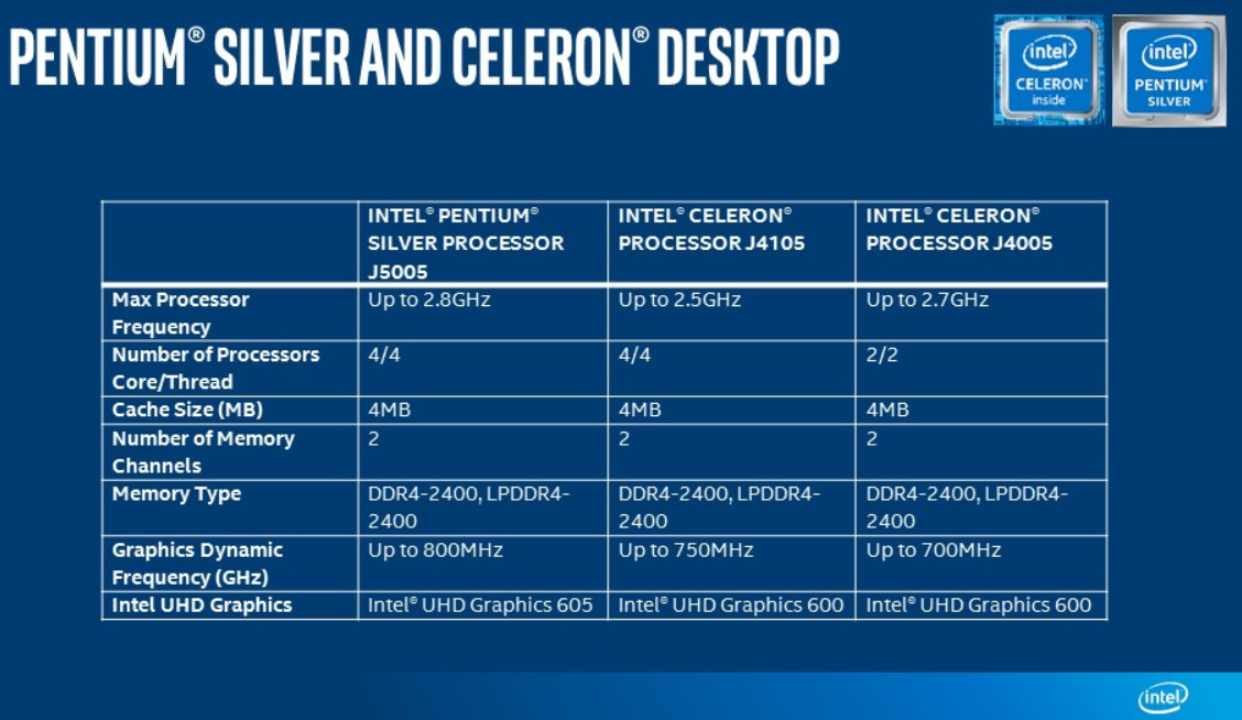 Intel comercializará al menos seis procesadores distintos Pentium® Silver and Intel Celeron®, (N5000, J5005, N4100, N4000, J4105, J4005) con doble y cuádruple núcleo de procesamiento nativo con frecuencia de hasta 2,8 GHz, 4 Mbytes de caché, soporte para memorias DDR4-2400 y gráficas integradas Intel® UHD Graphics de la serie 600 con frecuencia de hasta 800 MHz.