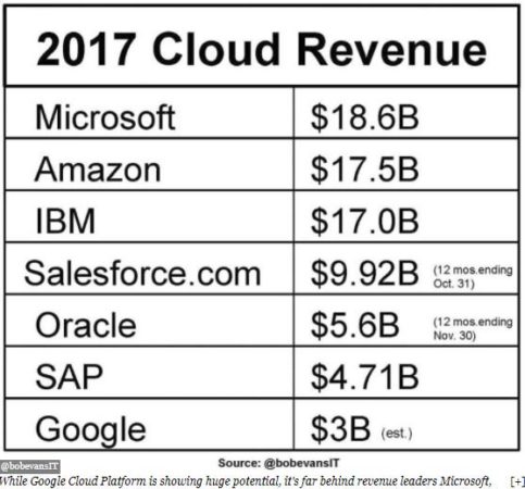 Mientras, Oracle y SAP siguen viendo crecer poco a poco sus áreas dedicadas a la nube. Ambas están invirtiendo con fuerza en tecnologías de nube híbrida, así como en programas dedicados a afianzar la credibilidad entre sus usuarios. Y Google, aunque ha conseguido unos resultados destacables en 2017, todavía queda por detrás en la nube. A pesar de todos sus recursos, tanto financieros como tecnológicos, no se ha tomado este mercado en serio hasta hace muy poco. Muchos dicen que Oracle y SAP llegaron tarde a la nube, pero es Google la que realmente se ha quedado rezagada con respecto a las otras seis. Eso sí, parece que se van a tomar en serio la nube de ahora en adelante, por lo que habrá que estar muy atentos a los pasos de los de Mountain View en la nube.