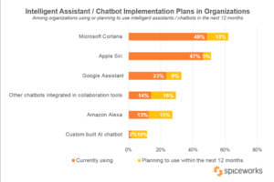 El resultado puede parecer sorprendente. Según la encuesta, el 49% de las organizaciones usan Microsoft Cortana, y un 13% espera empezar a hacerlo en los próximos 12 meses. Le sigue muy de cerca Apple Siri, con el 47% y un crecimiento esperado del 5% el próximo año. Ya más lejos se encuentran Google Assistant (23% y 9%), otros asistentes integrados en herramientas colaborativas (14% y 16%), Amazon Alexa (13% y 15%) y aplicaciones a medida (2% y 10%). Pero si consideramos qué tipo de dispositivos son los más empleados en el lugar de trabajo , quizá la sorpresa no sea tan grande. La mayoría de las empresas están equipadas con ordenadores Windows, de modo que cabe preguntarse si lo extraño no es, en realidad, la poca diferencia entre Microsoft Cortana y Apple Siri. Esto nos da una pista de la elevada implantación tanto del iPhone (Microsoft Phone ya no existe) como de iPad en el mundo empresarial. La gran fuerza de Cortana, obviamente, se encuentra en los PCs:está perfectamente integrado en Windows y funciona a la perfección con herramientas colaborativas como Microsoft Teams o Skype.