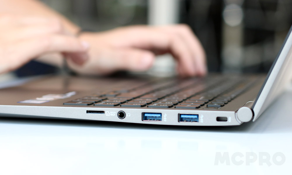 Uno de los apartados en los que suelen cojear los portátiles tan delgados como el Gram es en la conectividad. Una carcasa de mínimo espesor suele poner dificultades para que los ingenieros y diseñadores puedan integrar puertos de tamaño estándar en un número suficiente. El Gram cumple de sobra en este caso ya que ofrece conexión HDMI estándar, puerto Thunderbolt 3, un puerto USB C, 2 puertos USB 3.0, ranura para Micro SD (ideal para aumentar el almacenamiento de 512 GB de la SSD interna). A diferencia de otros fabricantes la conexión del cargador es redonda y no USB C.