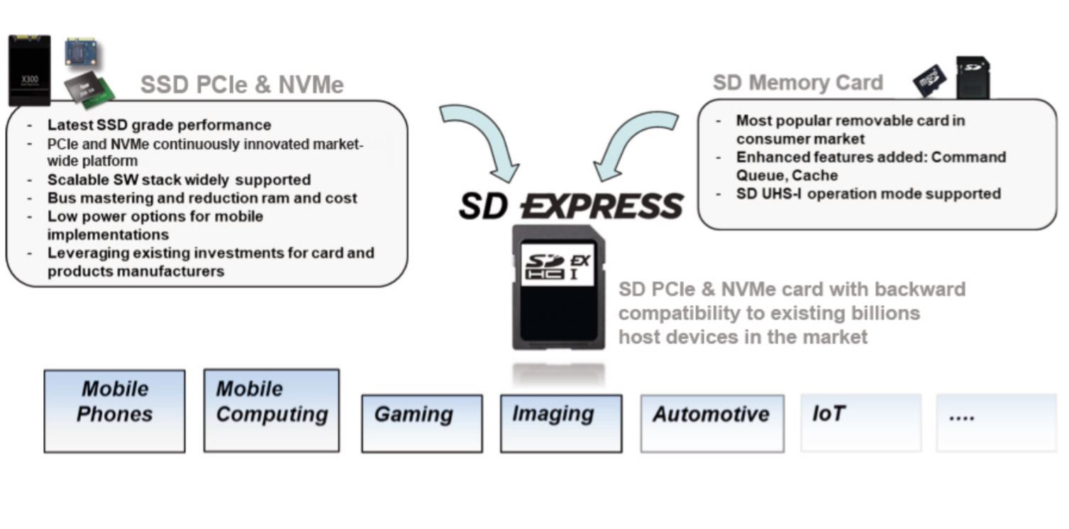 SD Express es la nueva versión del estándar de tarjetas de memoria presentado por el grupo industrial SD Association y promete ser una revolución en capacidad y rendimiento al añadir interfaces PCI Express y NVMe a la interfaz SD heredada.