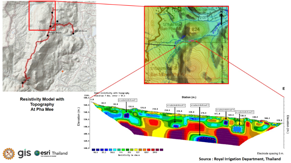 Se emplearon mapas para mostrar los resultados de las pruebas de resistividad del terreno, que ayudaron a detallar la ubicación de pasajes subterráneos. Estas mediciones fueron realizadas e interpretadas por las autoridades tailandesas (Royal Irrigation Department & Department of Mineral Resources).