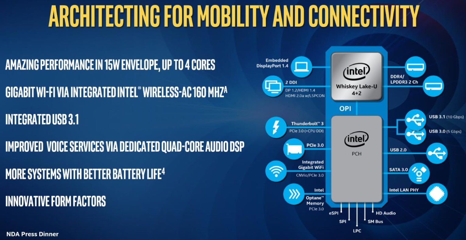 Son seis nuevos procesadores bajo las series Whiskey Lake y Amber Lake, fabricados en la última versión del proceso tecnológico de 14 nanómetros. Los nuevos procesadores son los de menor consumo de la última generación de Intel y prometen un rendimiento hasta 2 veces más elevado frente a un PC con 5 años de antigüedad y mejoras de dos dígitos en productividad ofimática para tareas de navegación web y creación de contenido respecto a la anterior generación, de acuerdo con los datos de la compañía.