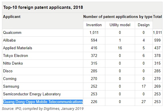 DigiTimes ha publicado una lista con el top diez de las empresas extranjeras que más patentes solicitaron en 2018, y Qualcomm está en cabeza con un total de 1.011 patentes. En el cuadro adjunto vemos diferenciadas tres categorías que son, ordenadas de izquierda a derecha: invenciones, modelos de utilidad y diseños.