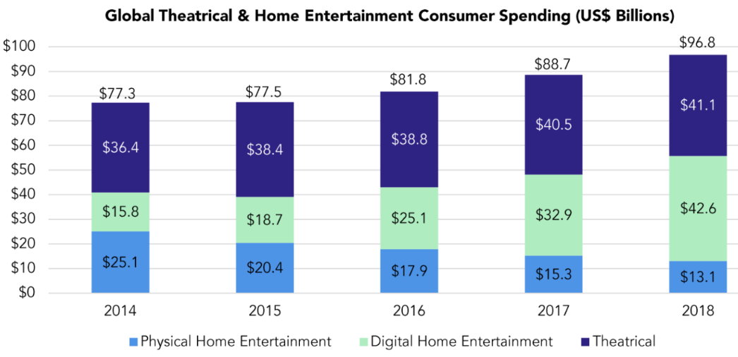 Según los datos de la asociación obtenidos de las firmas de análisis DEG e IHS Market, las ventas globales de formatos físicos de vídeo (DVD y Blu-ray) cayeron a la mitad en los últimos cinco años, con ingresos pasando de 25.200 millones de dólares en 2014 a solo 13.100 en 2018.