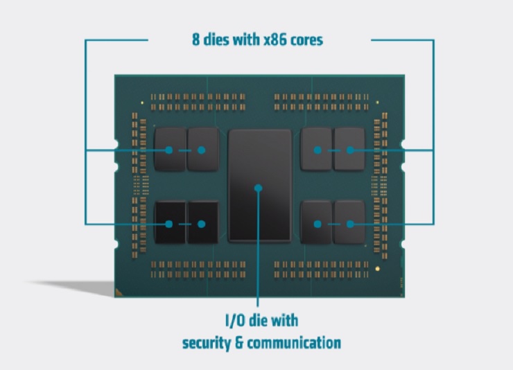 A nivel técnico Zen 2 representa un cambio importante no solo por las mejoras que trae a nivel de proceso de fabricación, ya que marca el salto a los 7 nm, sino que además introduce una nueva configuración en la que los núcleos de la CPU pasan a integrarse en unidades conocidas como chiplets, con ocho núcleos cada uno. Los elementos I/O, incluidas las controladoras de memoria, se externalizan a un chip dedicado que comunica con todos los chiplets que forman el procesador.