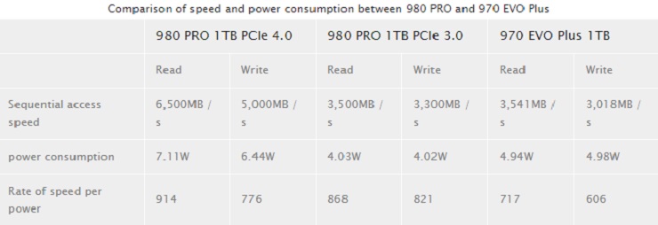 En el cuadro adjunto podemos ver una comparativa completa de rendimiento y consumo de tres unidades SSD diferentes de Samsung, el 980 PRO bajo PCIE Gen4 x4, este mismo modelo bajo PCIE Gen3 x4 y el 970 EVO Plus bajo PCIE Gen3 x4. Además de la mejora a nivel de velocidades de lectura y de escritura podemos confirmar otro detalle interesante, y es que el incremento en términos de consumo es mínimo, y al utilizar esta nueva unidad bajo el estándar PCIE Gen3 x4 se mejora la eficiencia energética frente a la generación anterior.