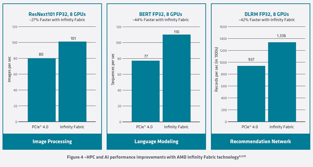Esta nueva aceleradora gráfica cuenta, además, con el respaldo de la plataforma ROCm 4.0, optimizada para ofrecer un mayor rendimiento y para sacar el máximo partido a esta nueva solución de AMD. El compilador de ROCm 4.0 es de código abierto y está totalmente unificado, lo que significa que admite tanto OpenMP 5.0 como HIP. Los marcos de PyTorch y Tensorflow, que se han optimizado con ROCm 4.0, consiguen también un mayor rendimiento con esta nueva aceleradora gráfica.