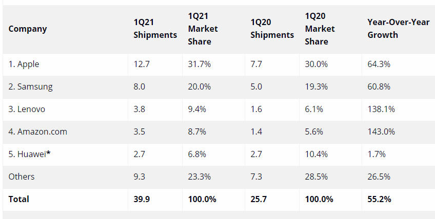 Según IDC, se enviaron 39,9 millones de tabletas electrónicas en el primer trimestre de 2021, lo que representa un aumento del 55,2 por ciento con respecto al mismo período del año anterior. Son niveles de venta que no se veían desde 2013 para un segmento que había caído con fuerza en el último año.