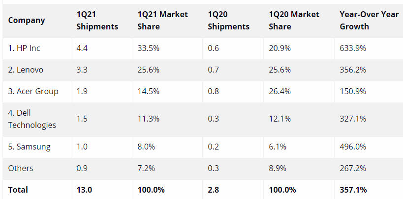 Top 5 proveedores de Chromebooks Q1-2021 – IDC