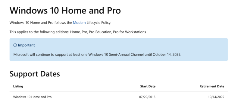 Y sin embargo, es esta segunda teoría la que hoy cobra más fuerza una vez que la propia Microsoft haya publicado en una de su página de política de gestión del «ciclo de vida» de sus aplicaciones, que la empresa «continuará dando soporte al menos a una actualización semianual de Windows 10 hasta el 14 de octubre de 2025». Un poquito más abajo leemos que la fecha de «retirada» de «»Windows 10 Home y Pro» será igualmente, el 14 de octubre de 2025.