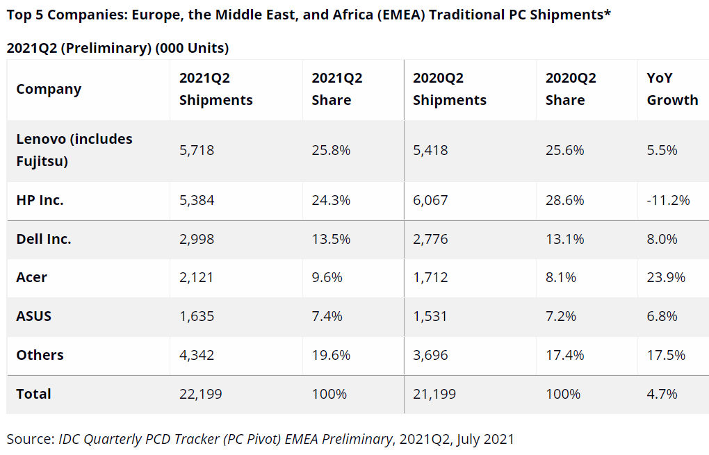 Los cinco grandes fabricantes de ordenadores personales en EMEA ocupan el 80% de cuota de mercado, mientras que los dos primeros, Lenovo y HP, tienen casi la mitad.