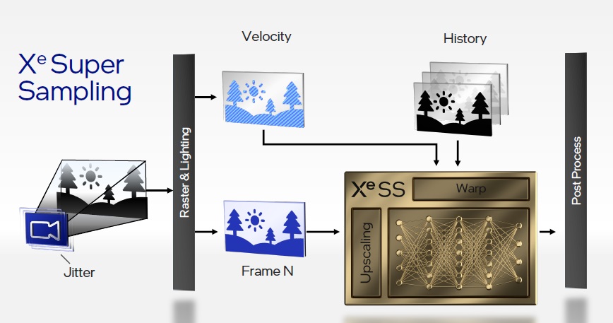 XeSS aprovecha la aceleración XMX AI construida en Alchemist para ofrecer una novedosa tecnología de escalado que permite obtener imágenes de alto rendimiento y alta fidelidad. Utiliza el aprendizaje profundo para sintetizar imágenes que se acercan a la calidad del renderizado nativo de alta resolución. Funciona reconstruyendo los detalles de los subpíxeles a partir de los píxeles vecinos, así como de los fotogramas anteriores compensados por el movimiento. Esta reconstrucción la realiza una red neuronal entrenada para ofrecer un alto rendimiento y una gran calidad, con un aumento del rendimiento de hasta el doble. XeSS ofrece un supermuestreo basado en IA en un amplio conjunto de hardware, incluidos los gráficos integrados, aprovechando el conjunto de instrucciones DP4a.