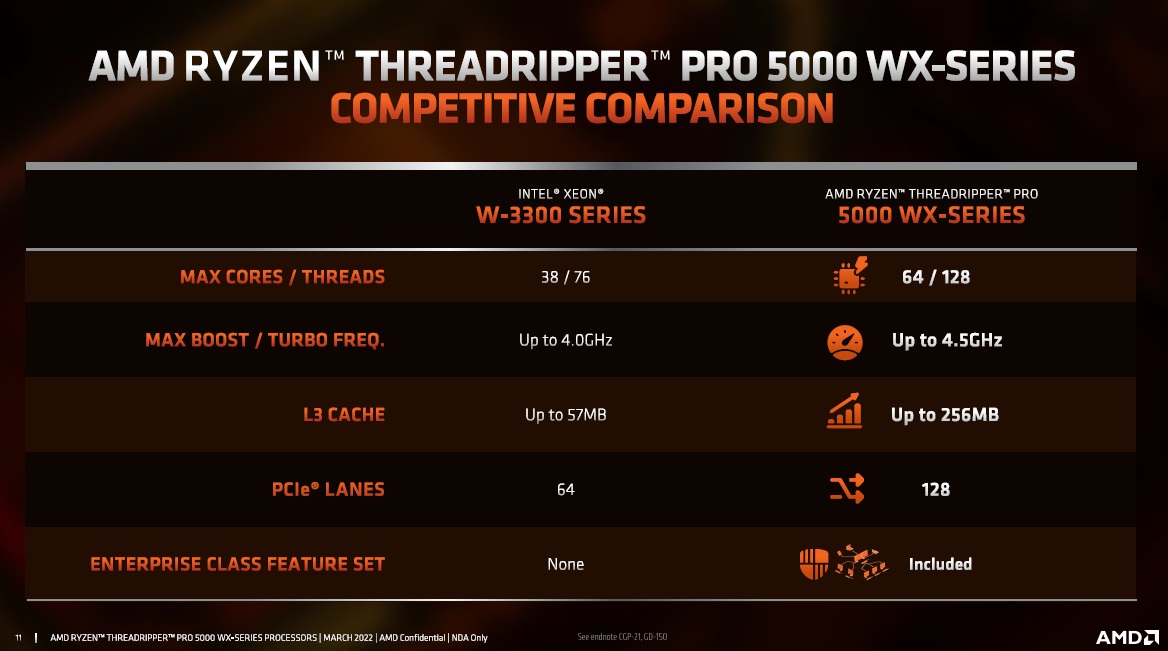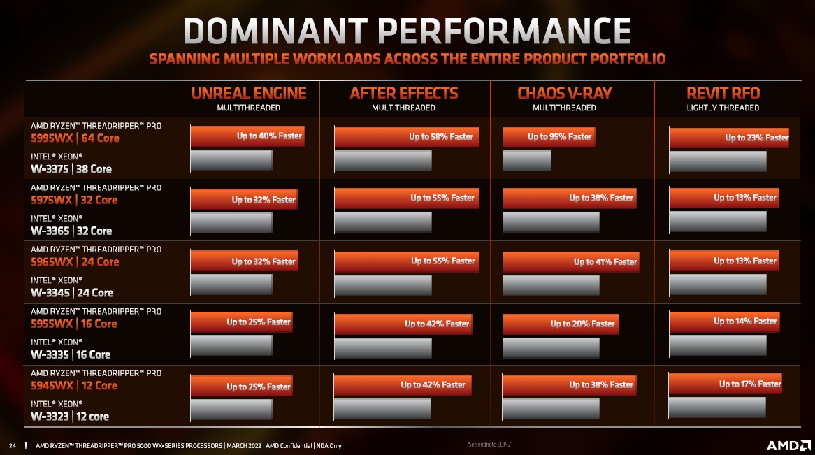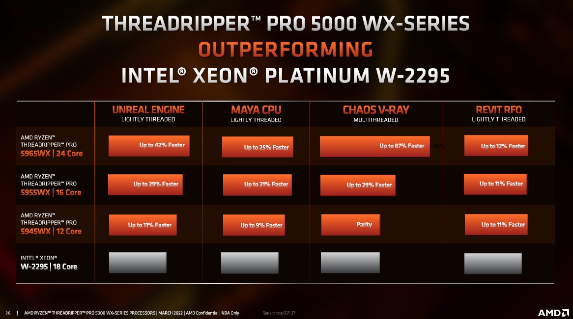 Según AMD, los procesadores Ryzen Threadripper PRO 5000 WX reducen el consumo por núcleo hasta en un 67%, ofrecen un 39% más de rendimiento en renderizado y tienen hasta el doble de rendimiento por vatio que sus rivales directos, unos valores muy buenos que parten del TDP agregado de cada CPU.