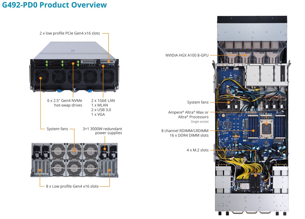 Por lo que respecta a sus especificaciones, los GIGABYTE G492-PD0 se pueden configurar, como hemos anticipado, con un procesador Ampere Altra Max o Ampere Altra de hasta 128 núcleos, utilizan la plataforma NVIDIA HGX A100, que cuenta con ocho aceleradoras gráficas GA100 de NVIDIA y cada una dispone de 80 GB de memoria HBM2E.