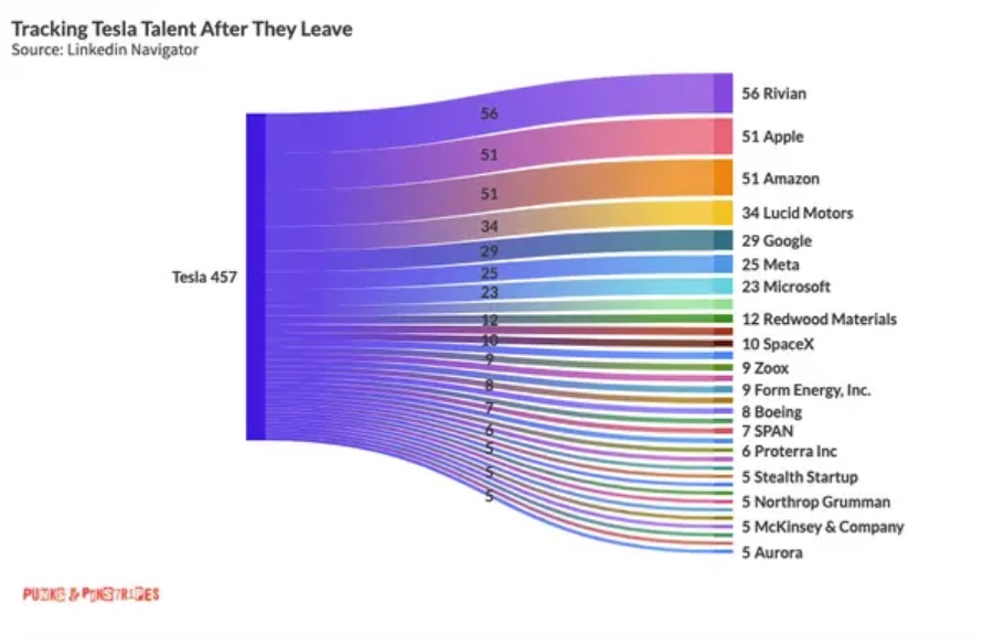 La mayoría de esos ex-trabajadores están pasando a engrosar las filas de compañías como Google, Amazon y Apple. Según los datos de un informe publicado por Punks & Pinstripes, alrededor de 457 personas dejaron su puesto de trabajo en Tesla en los últimos noventa días (datos basados en LinkedIn). Como podemos ver en la gráfica adjunta, de esos 457 trabajadores un total de 56 se unieron a Rivian, 51 pasaron a formar parte de la plantilla de Apple y otros 51 engrosaron las filas de Amazon.
