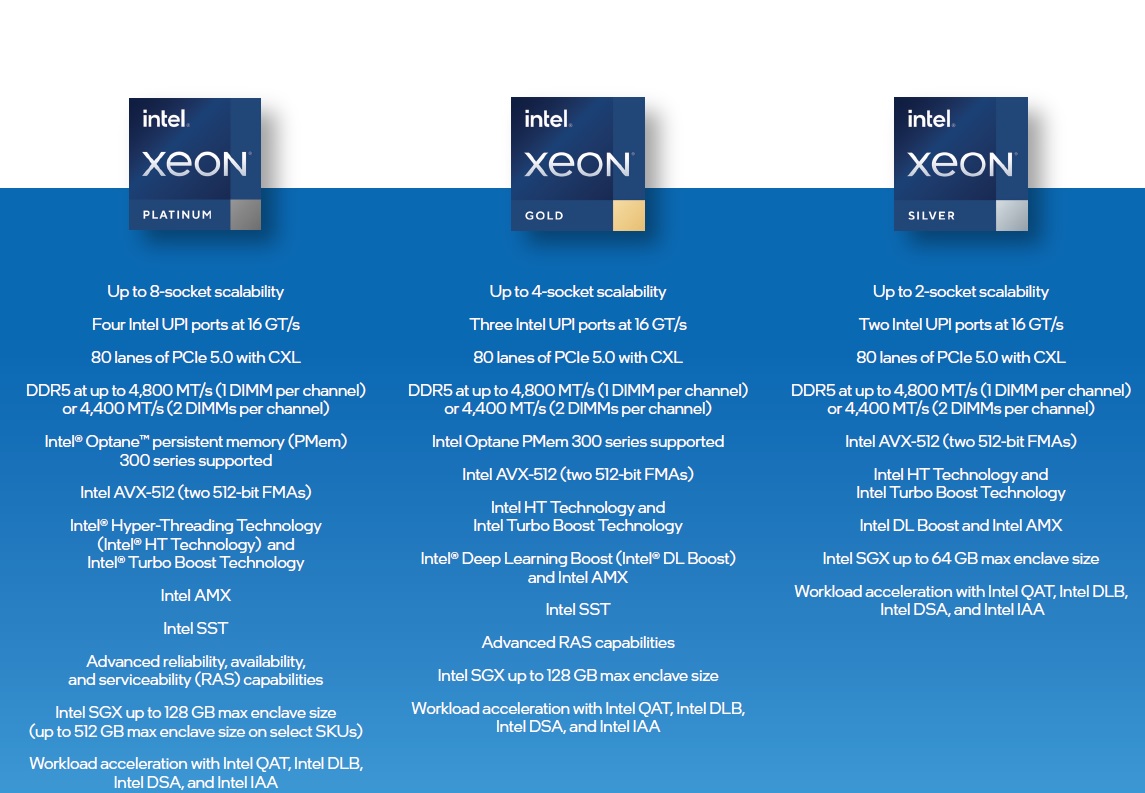 Intel lanzará un total de tres gamas de procesadores Xeon Sapphire Rapids que podemos ver perfectamente definidas en la imagen que encontraréis justo encima de estas líneas. La serie Platinum será la opción tope de gama, y estará acompañada de las gamas Gold y Silver, siendo esta última la más económica de las tres.