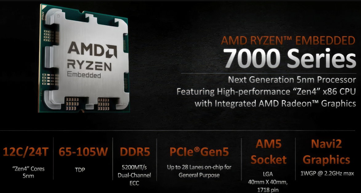 Los Ryzen Embedded 7000 Series son los primeros procesadores para sistemas integrados que utilizan tecnologías de fabricación avanzados en procesos de 5 nanómetros. Por supuesto, como hiciera con los Threadripper 7000 para estaciones de trabajo, AMD ha aprovechado su arquitectura de procesamiento ZEN 4 y los gráficos integrados RDNA 2 lo que según la compañía, eliminan la necesidad de usar GPUs discretas.