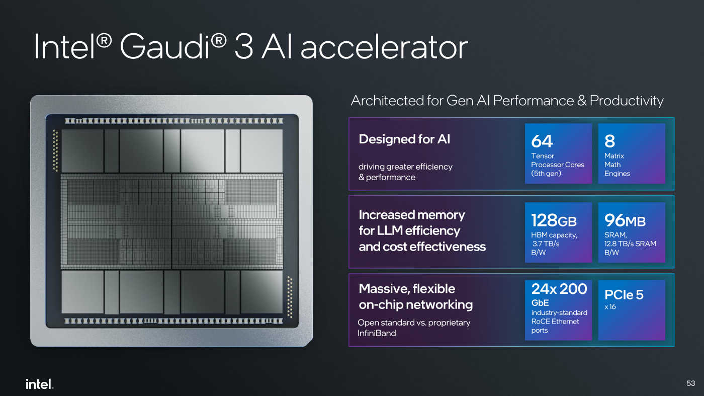 Intel Gaudi 3 fue otra de las estrellas de este evento, una potente aceleradora especializada en IA, inferencia y entrenamiento de IA generativa que ofrece un alto rendimiento y que está preparada para afrontar los desafíos que plantea la inteligencia artificial en su estado actual en materia de consumo, potencia, costes y escalabilidad, facilitando además las tareas de implementación y puesta en funcionamiento.