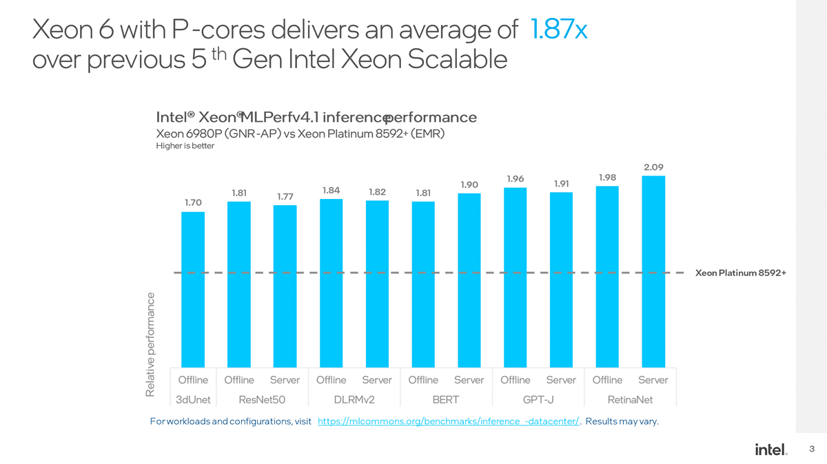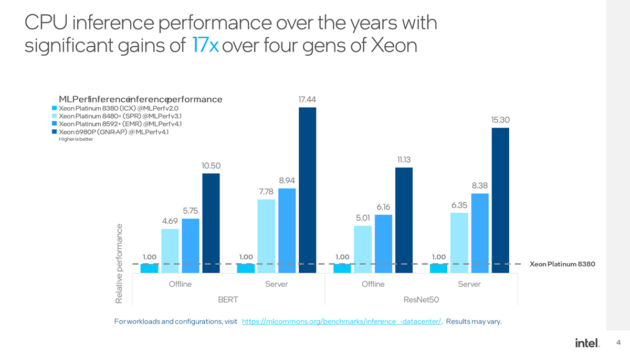En los últimos cuatro años Intel ha logrado avances significativos en el rendimiento de IA con CPU desde que presentó por primera vez los resultados en MLPerf. En comparación con los procesadores escalables Intel Xeon de tercera generación lanzados en 2021, los Intel Xeon 6 tienen un rendimiento hasta 17 veces mejor en el procesamiento del lenguaje natural (BERT) y hasta 15 veces más en las cargas de trabajo de visión artificial (ResNet50).