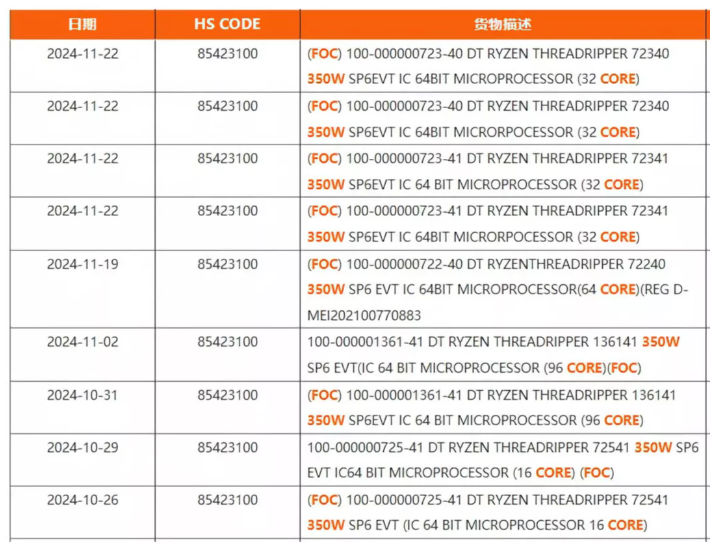 El manifiesto de envío de la firma de logística, revela que AMD está preparando variantes de 96, 64, 32 y 16 núcleos. Cabe destacar que todos los SKU enumerados comparten un consumo TDP de 350W, idéntico al de las CPU «Storm Peak» de esta generación a las que reemplazarán. Se esperan dos líneas diferenciadas, la estándar Threadripper y los Threadripper PRO.