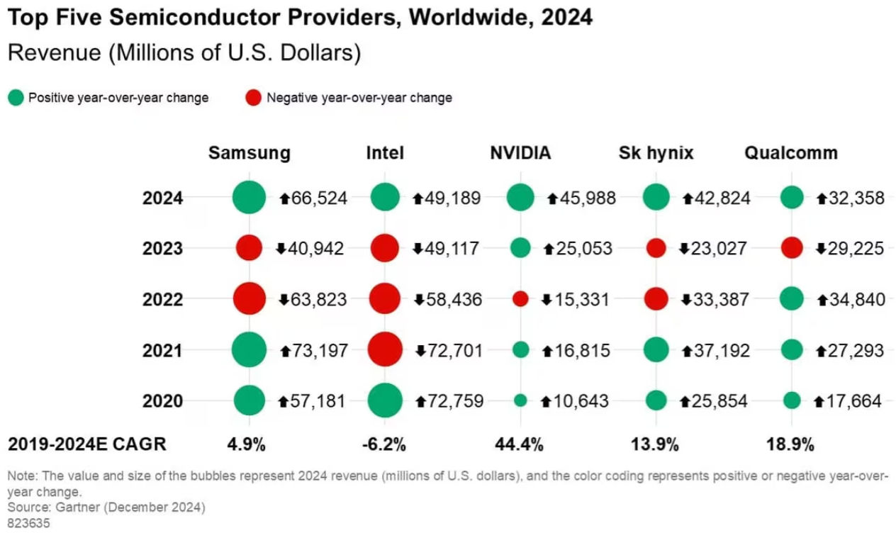 Samsung Electronics recuperó en 2024 la corona mundial en ingresos por venta de semiconductores, según los datos de Gartner. Si el gran perdedor fue Intel (como era esperable) otros de los grandes «vencedores» fueron NVIDIA y SK Hynix, ambos aprovechando su posición en hardware para IA.