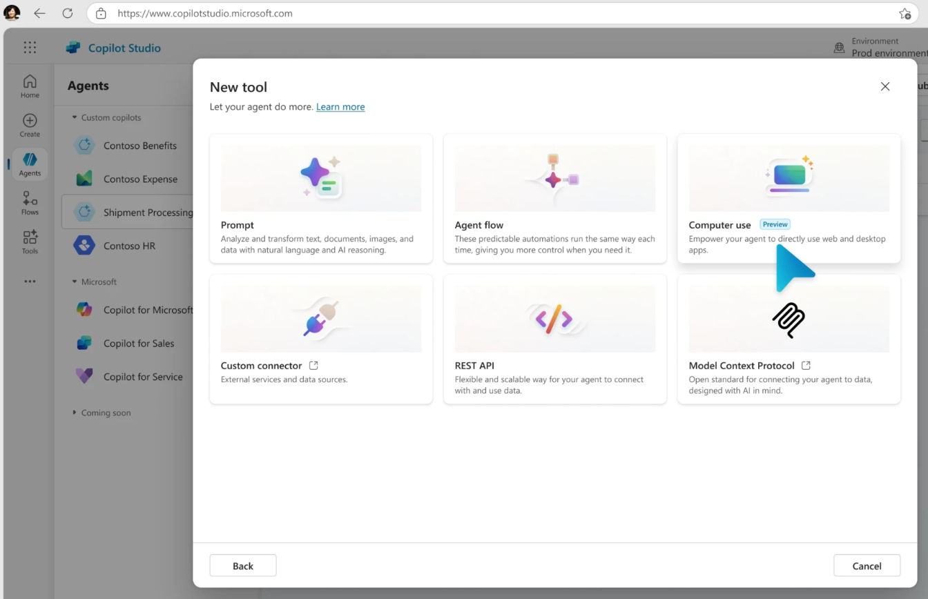 Denominada «Uso de la Computadora», esta herramienta permite a los agentes de Copilot Studio interactuar con cualquier sitio web o aplicación de escritorio como si fueran herramientas. Ahora pueden hacer clic en botones, seleccionar menús y escribir en campos de aplicaciones y sitios web. Lo más interesante de esta característica es que permite a los agentes operar en entornos sin API disponibles para la integración programática.