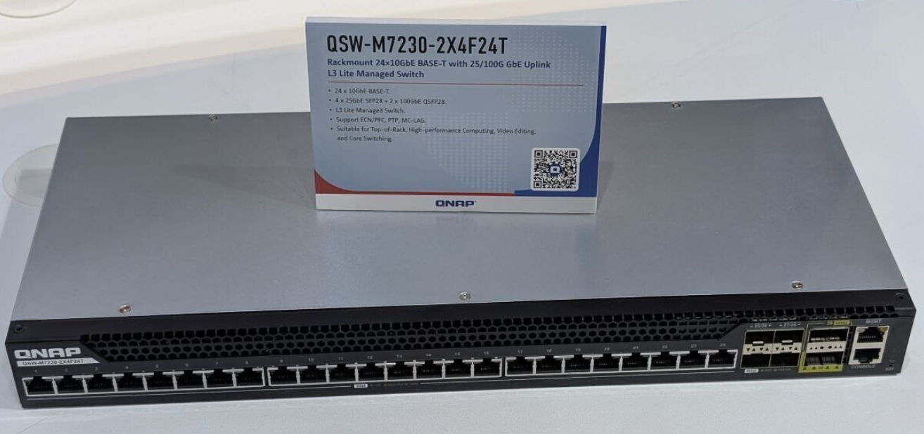 Un elemento clave de la ampliación del portfolio pasa por el switch gestionable QSW-M7230-2X4F24T, un L3 Lite de montaje en rack 1U con 24 puertos de cobre 10 GbE Bsuena ASE-T, cuatro interfaces de fibra SFP28 de 25 GbE y dos enlaces ascendentes QSFP28 de 100 GbE. Compatible con ECN y PFC para garantizar Ethernet sin pérdidas, PTP para una sincronización horaria precisa y MC-LAG para redundancia automática de enlaces, este switch proporciona una plataforma de gestión unificada ideal tanto para clústeres de computación con uso intensivo de GPU como para entornos de edición de vídeo de alto rendimiento.