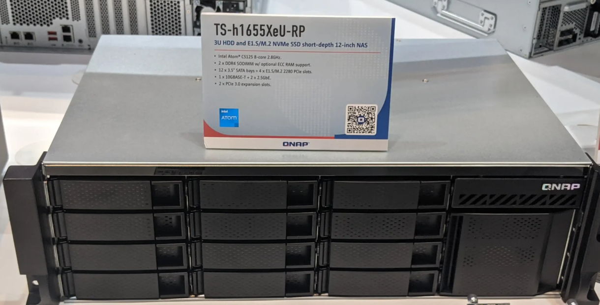 Para entornos de montaje en rack que requieren fiabilidad de nivel empresarial, QNAP presenta el TS-h1655XeU-RP. Este NAS 3U de profundidad reducida incorpora un procesador Intel Atom C5125 de ocho núcleos y admite memoria ECC opcional, 12 bahías para unidades SATA y cuatro ranuras PCIe E1.S/M.2. Sus puertos integrados de 10 GbE y dos de 2,5 GbE, junto con ranuras de expansión PCIe adicionales, lo convierten en una opción versátil para instalaciones con espacio limitado que no pueden comprometer el rendimiento ni la integridad de los datos.