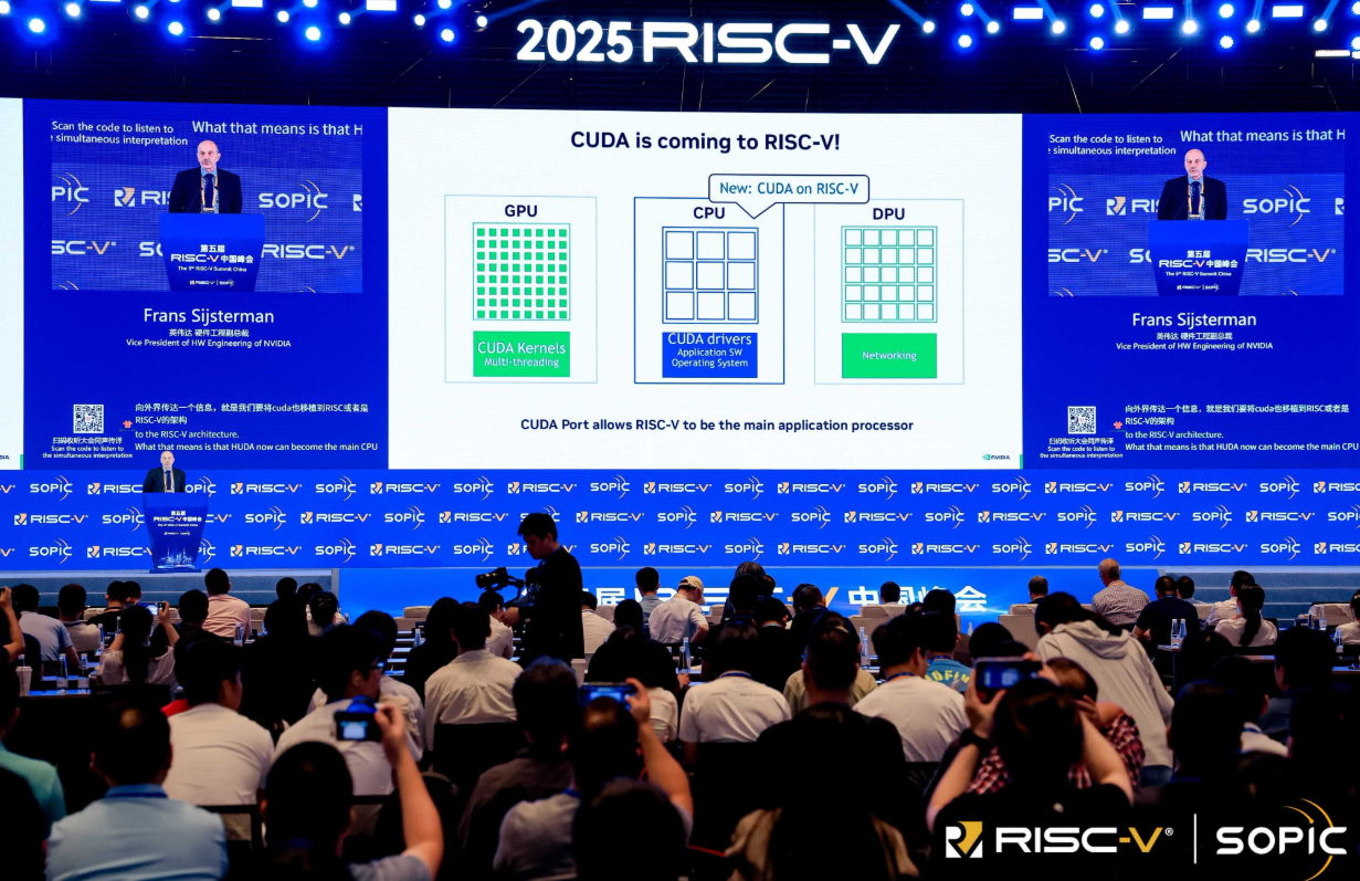 El perfil de NVIDIA en RISC-V parece elevado, ya que la conferencia principal en la Cumbre RISC-V de China estuvo a cargo de Frans Sijsterman, el vicepresidente de Ingeniería de Hardware. La presentación describió cómo los componentes CUDA se ejecutarán en RISC-V. El diagrama presentado ilustró una configuración típica: la GPU gestiona cargas de trabajo paralelas, mientras que una CPU RISC-V ejecuta los controladores del sistema CUDA, la lógica de la aplicación y el sistema operativo.