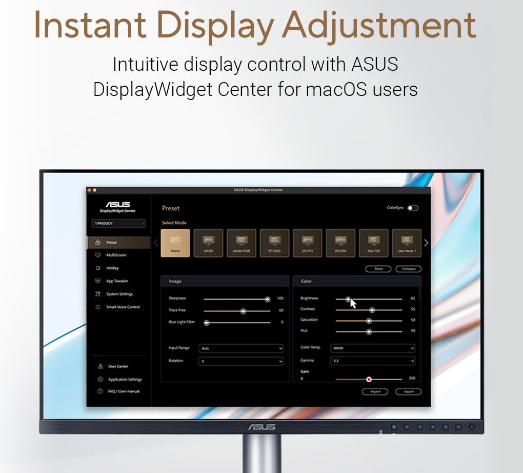 El software ASUS DisplayWidget Center para macOS permite ajustar fácilmente la configuración del equipo, incluyendo brillo, contraste y temperatura de color, mejorando la experiencia visual. De la misma manera, la aplicación también cuenta con teclas de acceso rápido del MacBook para ajustar el brillo del monitor.