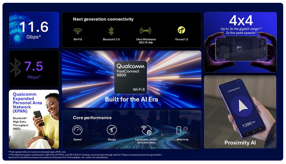 FastConnect 8800 es también el único sistema de conectividad móvil que ofrece Wi-Fi 8, Bluetooth 7.0, Ultra Wideband 802.15.4ab y Thread 1.5 en una solución de un solo chip. El sistema también incorpora IA de proximidad, que utiliza UWB, sondeo de canal Bluetooth, medición de distancia Wi-Fi y otras tecnologías de detección para un rastreo preciso con precisión centimétrica. Qualcomo asegura que «no solo revolucionará la conectividad de los smartphones, sino que también beneficiará a otros formatos e industrias, como tabletas, portátiles, robótica y más».