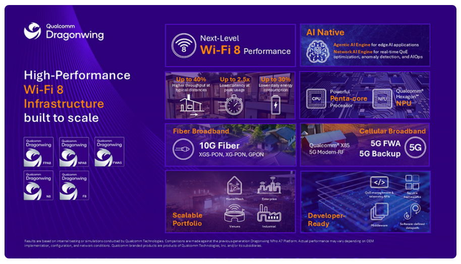 - Qualcomm Dragonwing FiberPro A8 Elite ofrece el mismo rendimiento de Wi-Fi 8 de confiabilidad ultra alta, inteligencia de borde de próxima generación y aceleración de IA a nivel de plataforma que la anterior, complementado con acceso de fibra 10G (PON), ideal para operadores y OEM que apuntan a una solución de puerta de enlace unificada y lista para fibra.