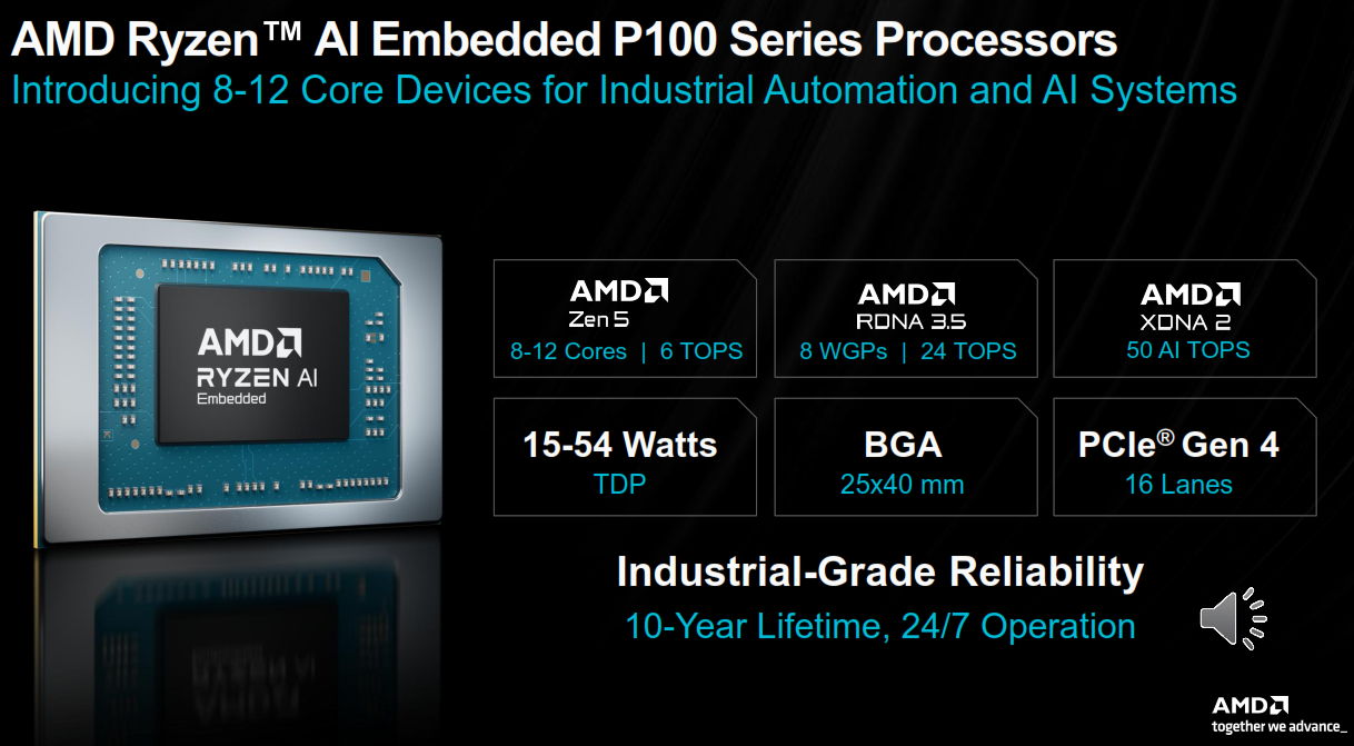 Los nuevos Ryzen AI Embedded P100 Series cuentan con hasta 12 núcleos de procesamiento Zen 5, hasta 80 TOPS de sistema para aceleración de IA física, gráficos integrados AMD RDNA 3.5 para visualización en tiempo real y una unidad de procesamiento neuronal (NPU) basada en la arquitectura AMD XDNA 2 para inferencia de IA de baja latencia y bajo consumo de energía. Y todo en un solo chip.