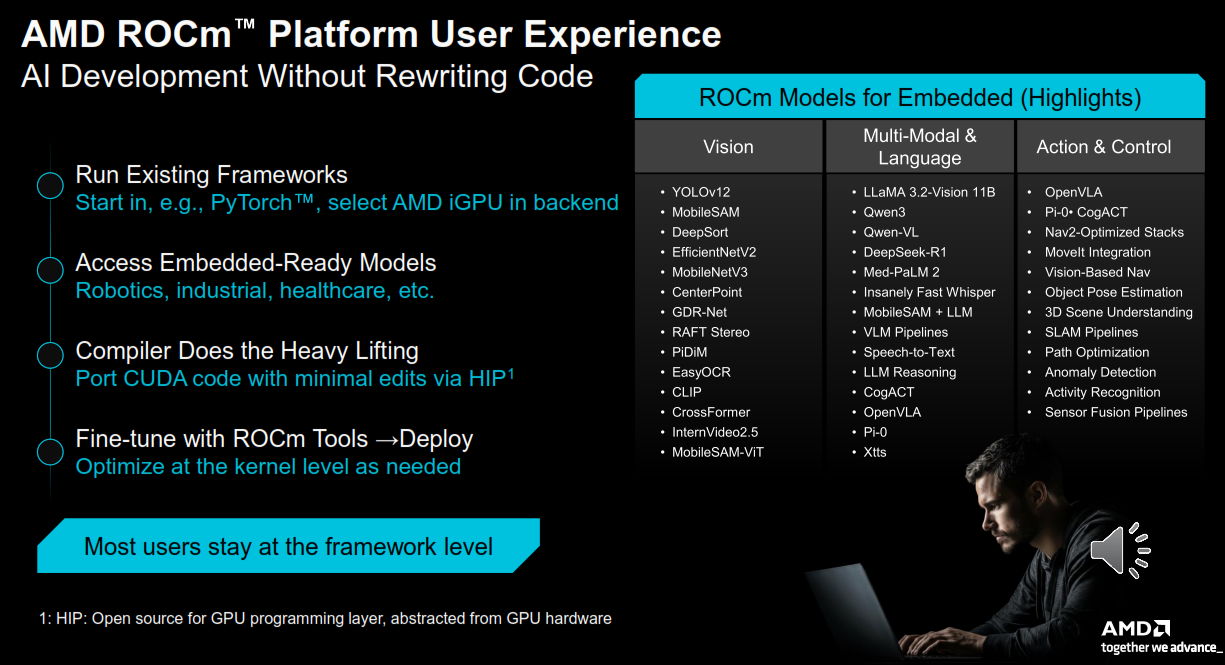 La compatibilidad con el ecosistema de software abierto AMD ROCm, aporta una pila de software de IA de código abierto y probada a las aplicaciones integradas. Los desarrolladores pueden ejecutar marcos de IA estándar con compiladores, entornos de ejecución y bibliotecas de código abierto, con acceso inmediato a modelos compatibles con la integración sin tener que reescribir el código. A nivel de programación, el software ROCm utiliza la Interfaz de Computación Heterogénea para la Portabilidad (HIP) de código abierto, lo que desvincula la programación de la GPU del hardware y elimina la dependencia del proveedor entre la pila de software y el hardware.