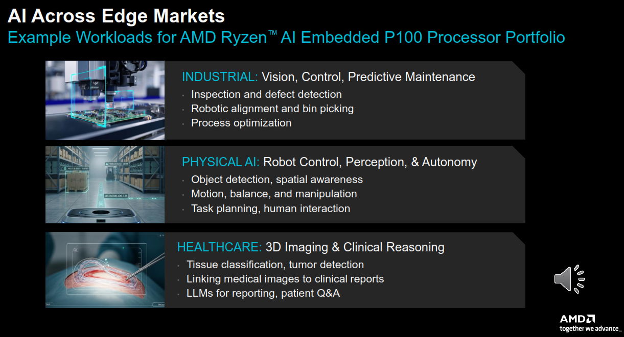 AMD enmarca su uso en aplicaciones exigentes, desde PCs industriales para fábricas inteligentes hasta robots autónomos y dispositivos de imágenes médicas, asegurando que sus nuevos procesadores x86 integrados están optimizados para la próxima generación de IA industrial y casos de uso más amplios de inteligencia artificial de borde, que incluyen: