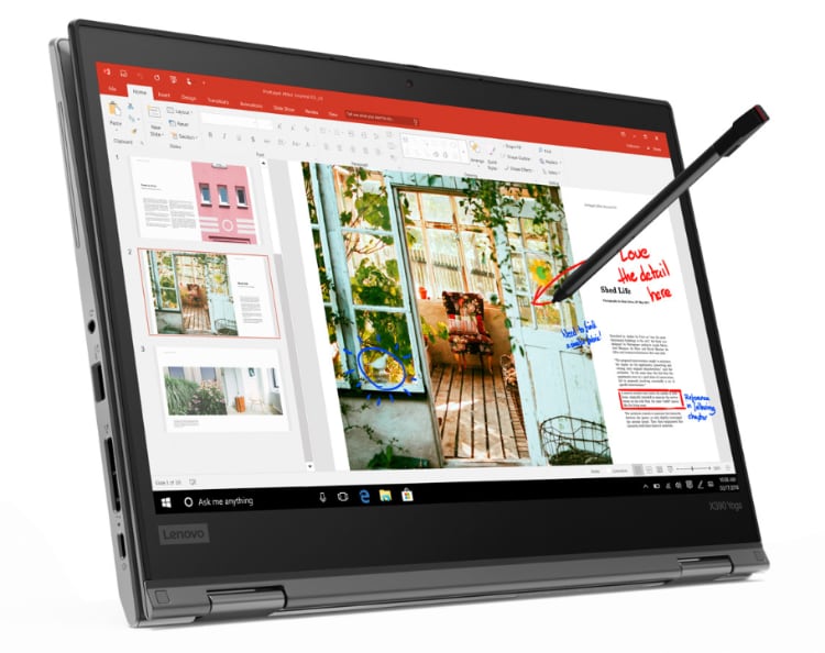Monta una pantalla multitáctil de 13,3 pulgadas con resolución FHD y soporte para lápices ópticos y la misma configuración de hardware y conectividad que el X390: procesadores Intel vPro de octava generación, 16 Gbytes de memoria RAM y SSD PCIe de hasta 1 Tbyte. Preinstala Windows 10 Pro y ofrece de serie soporte para el asistente Alexa de Amazon.