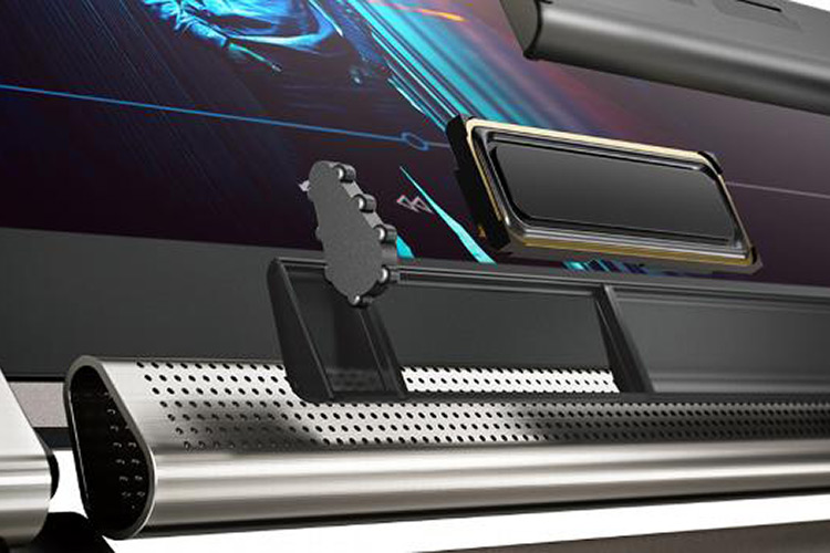 «Naturalmente, todo esto trajo consigo una gran cantidad de desafíos e innovaciones desde los puntos de vista mecánico, de calidad de sonido y de fabricación, que tuvimos que equilibrar dentro de la estética del conjunto y del factor de forma. La solución fue una bisagra de aluminio extruido con orificios realizados con láser sobre sus laterales pulidos. La colaboración con los ingenieros de Dolby permitió usar altavoces de agudos (tweeters) personalizados para mejorar la calidad del sonido, que se complementan con los altavoces de graves (woofers) en la base del equipo. Todos en conjunto forman el sistema de altavoces Dolby Atmos que, en conjunción con el software incorporado, optimizan la reproducción de sonido en todos los modos de uso».